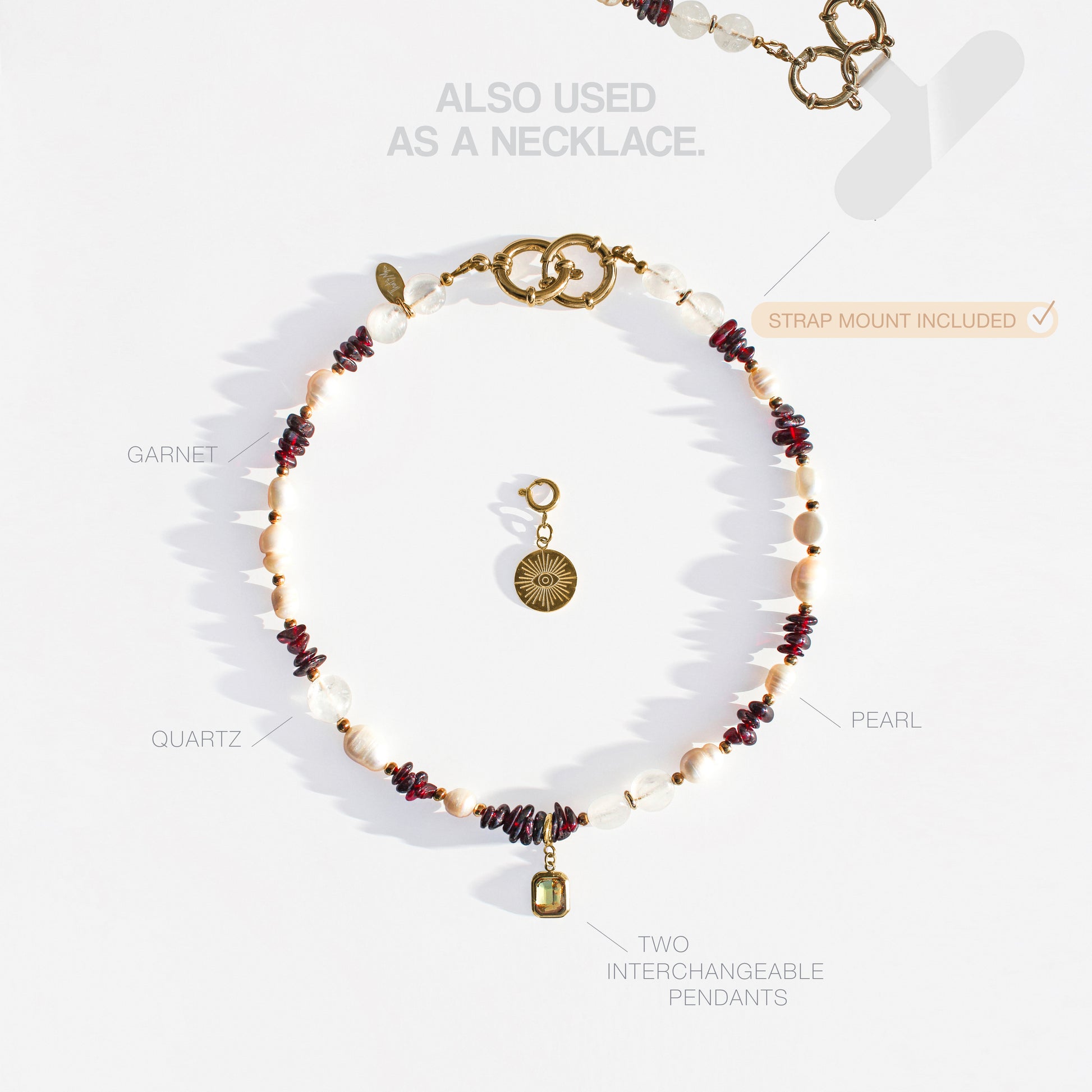 Thanks to the interchangeable pendants and convenient design, you can choose how to use it today: as a necklace, a phone bracelet, or a bag charm.