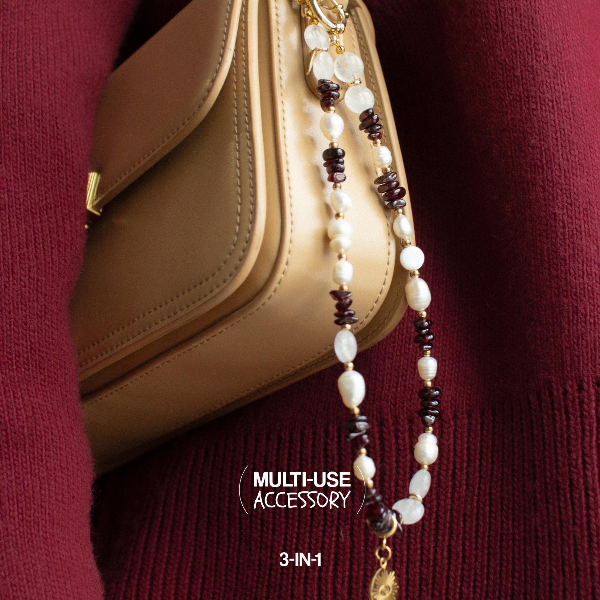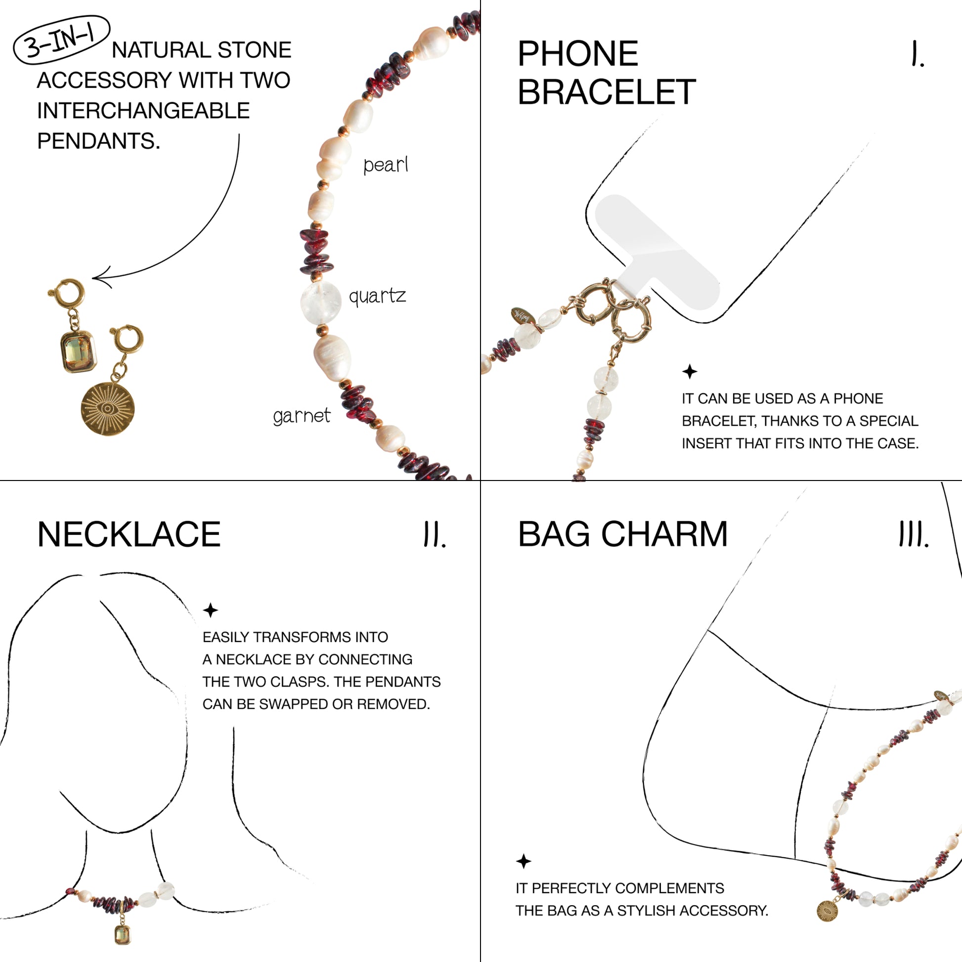 3-in-1 Handmade Accessory with Natural Stones Perla, combining three functions in one product.