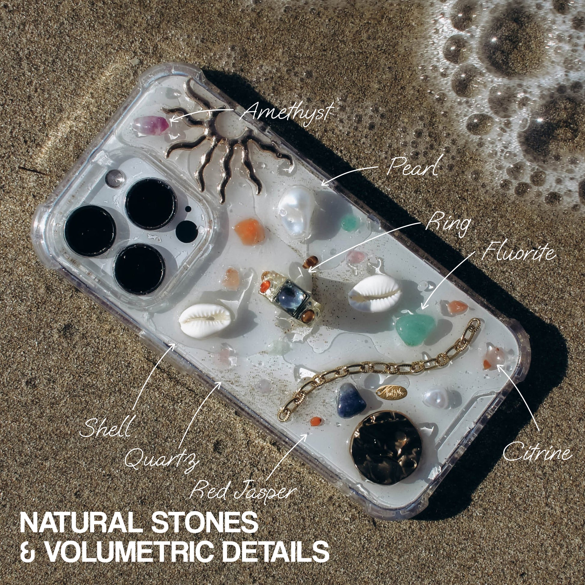 The natural stones and shells used in our products give each case its uniqueness and special charm, while the high-quality base ensures protection for the phone from all sides.