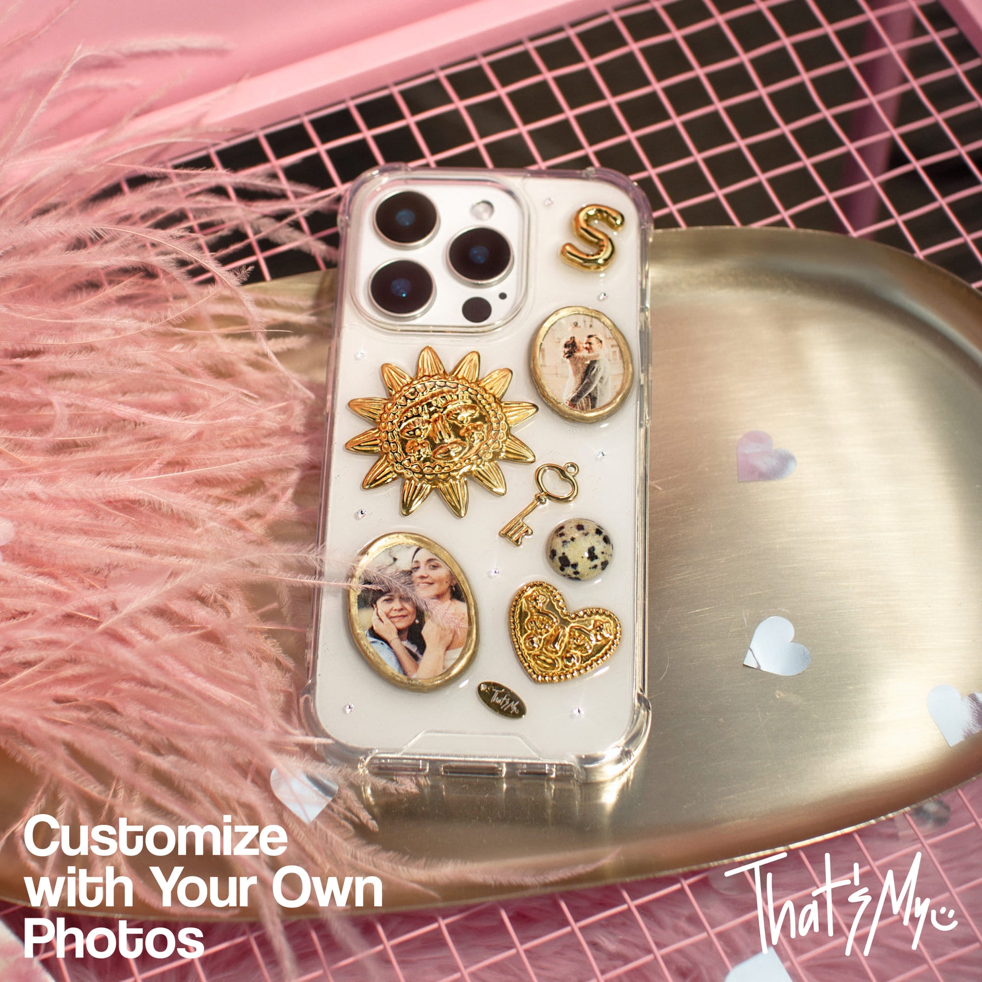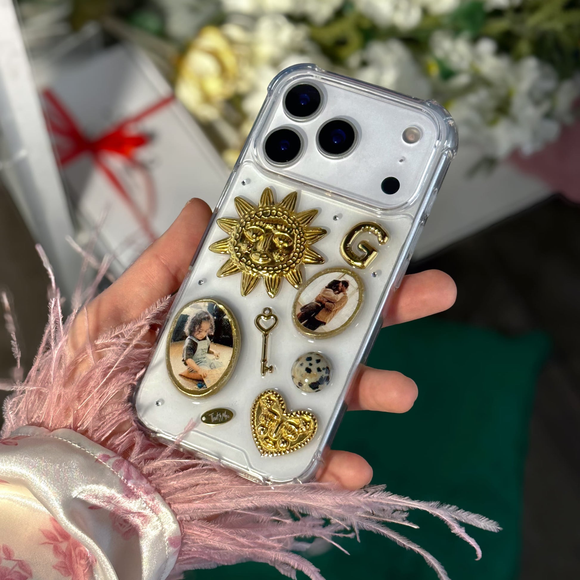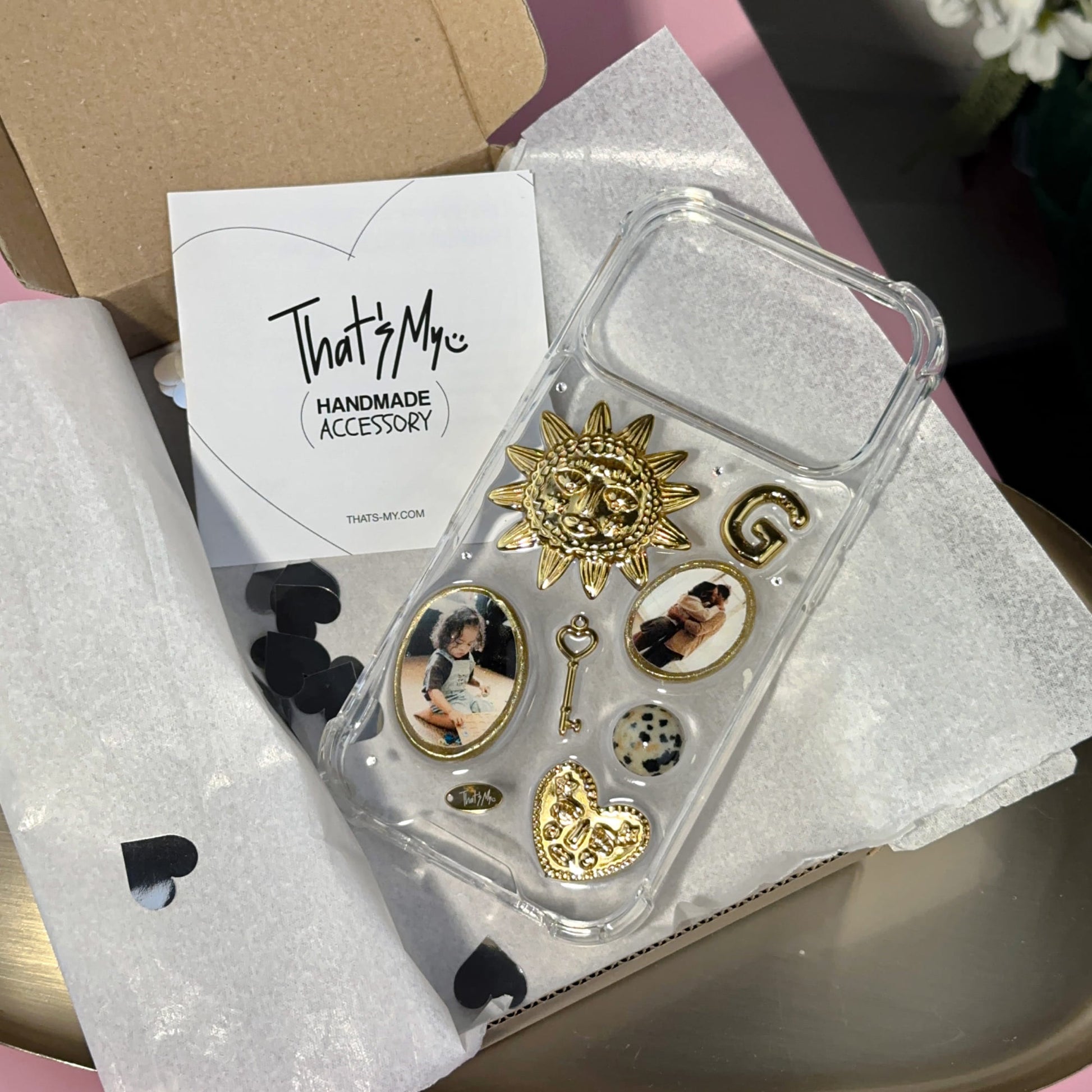 Each case is handcrafted. The photographs are placed in dimensional photo frames in a gold tone and complemented with three-dimensional decorative elements and shimmering crystals.