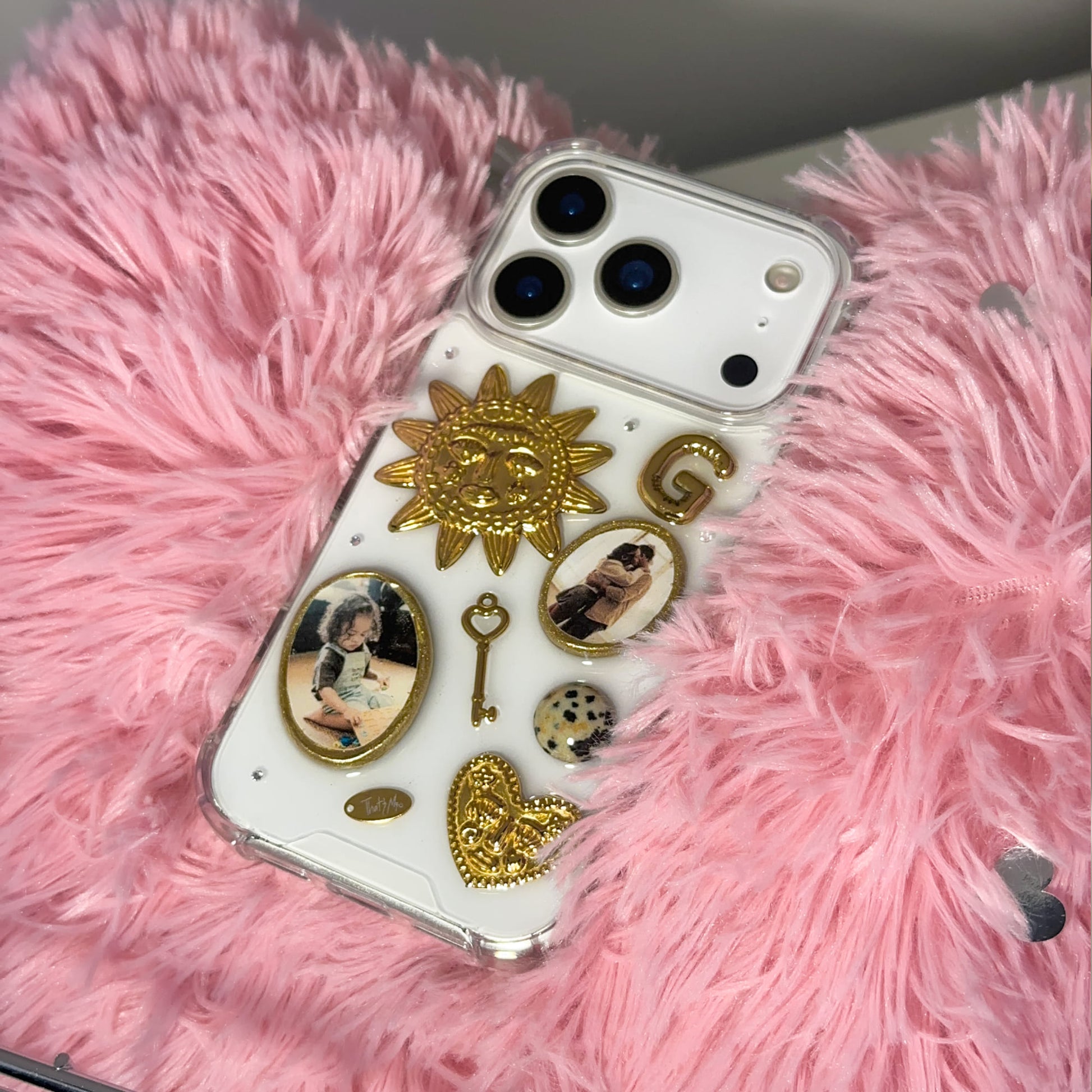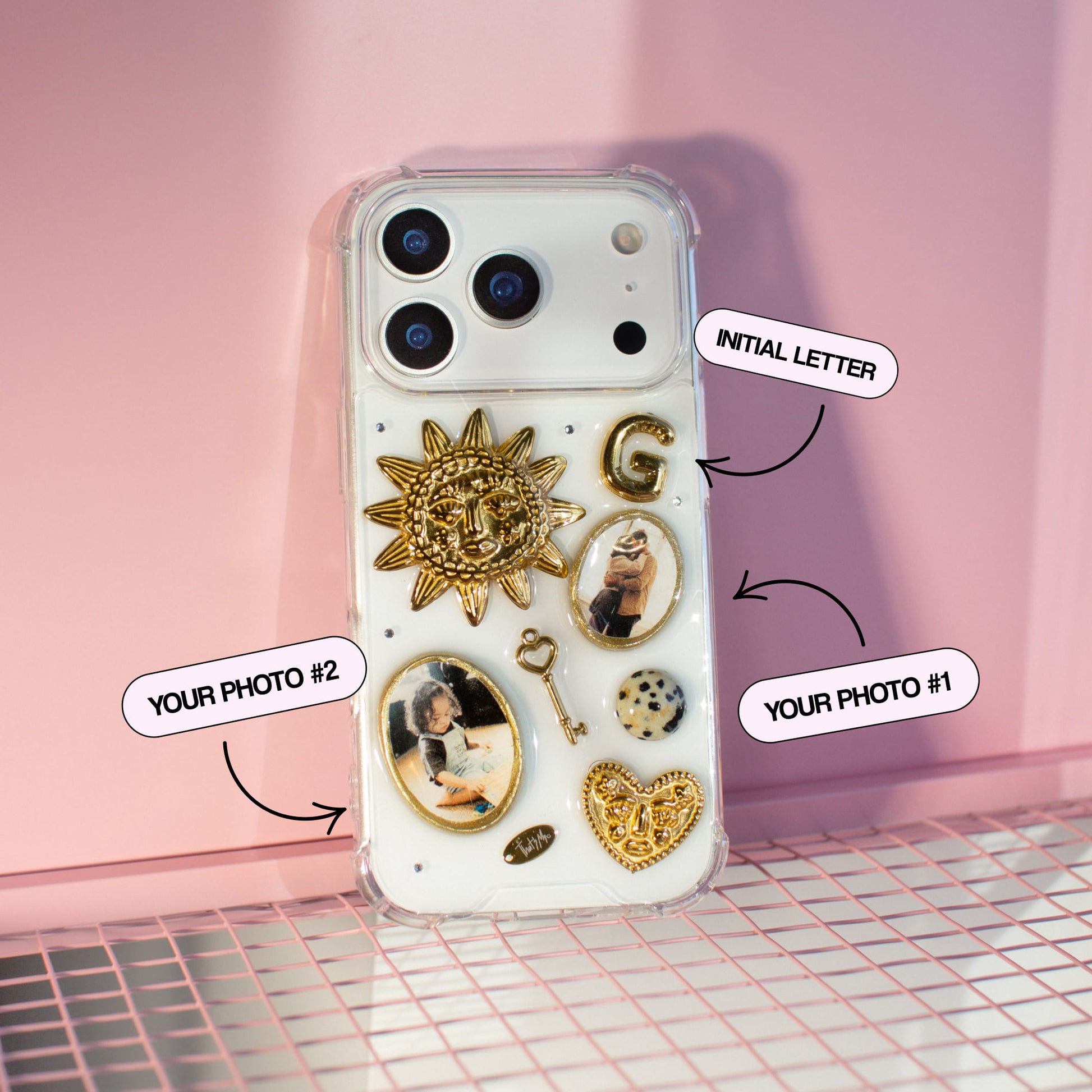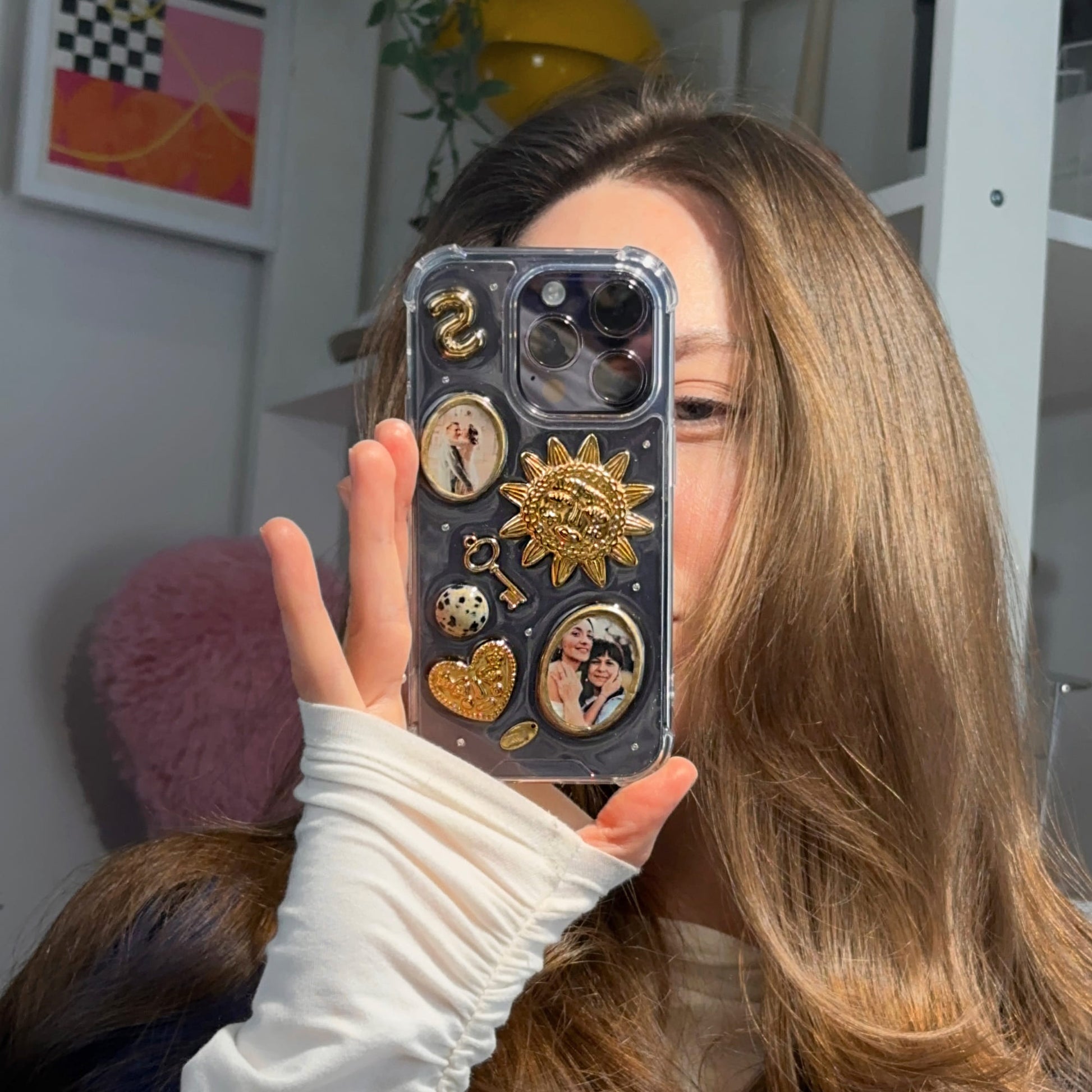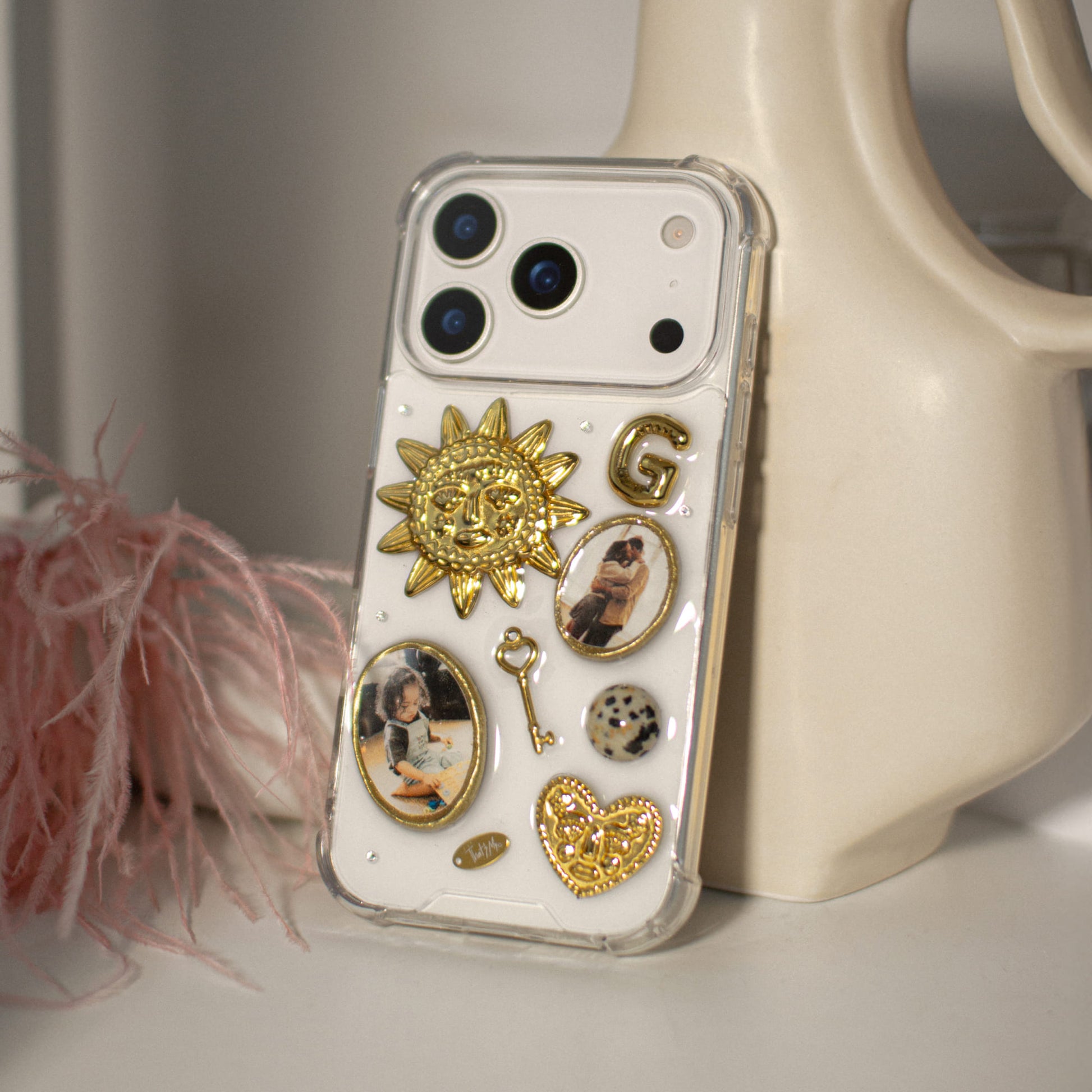 You can choose the base of the case: transparent or dark with a chameleon effect. The transparent base keeps the design light and highlights the photographs themselves. The dark chameleon base shifts its tone depending on lighting conditions and the color of your iPhone, creating soft color transitions around all embedded elements. This base does not fade over time and maintains its appearance with long-term use.
