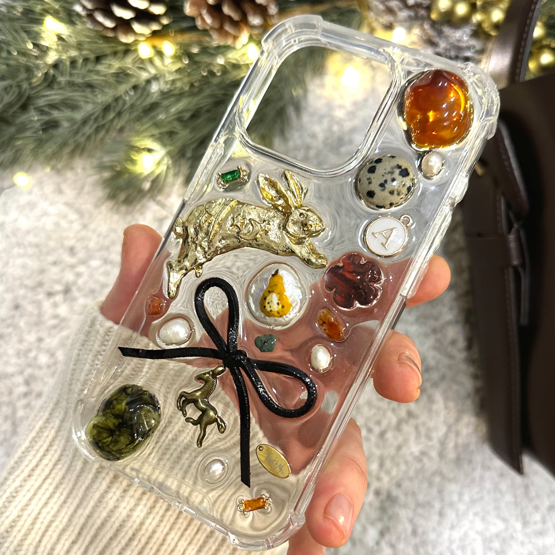 Limited edition design with natural pearls, stones and a personalized letter. Also included is a shiny insert for the case, which can be removed or inserted as you wish 🤍