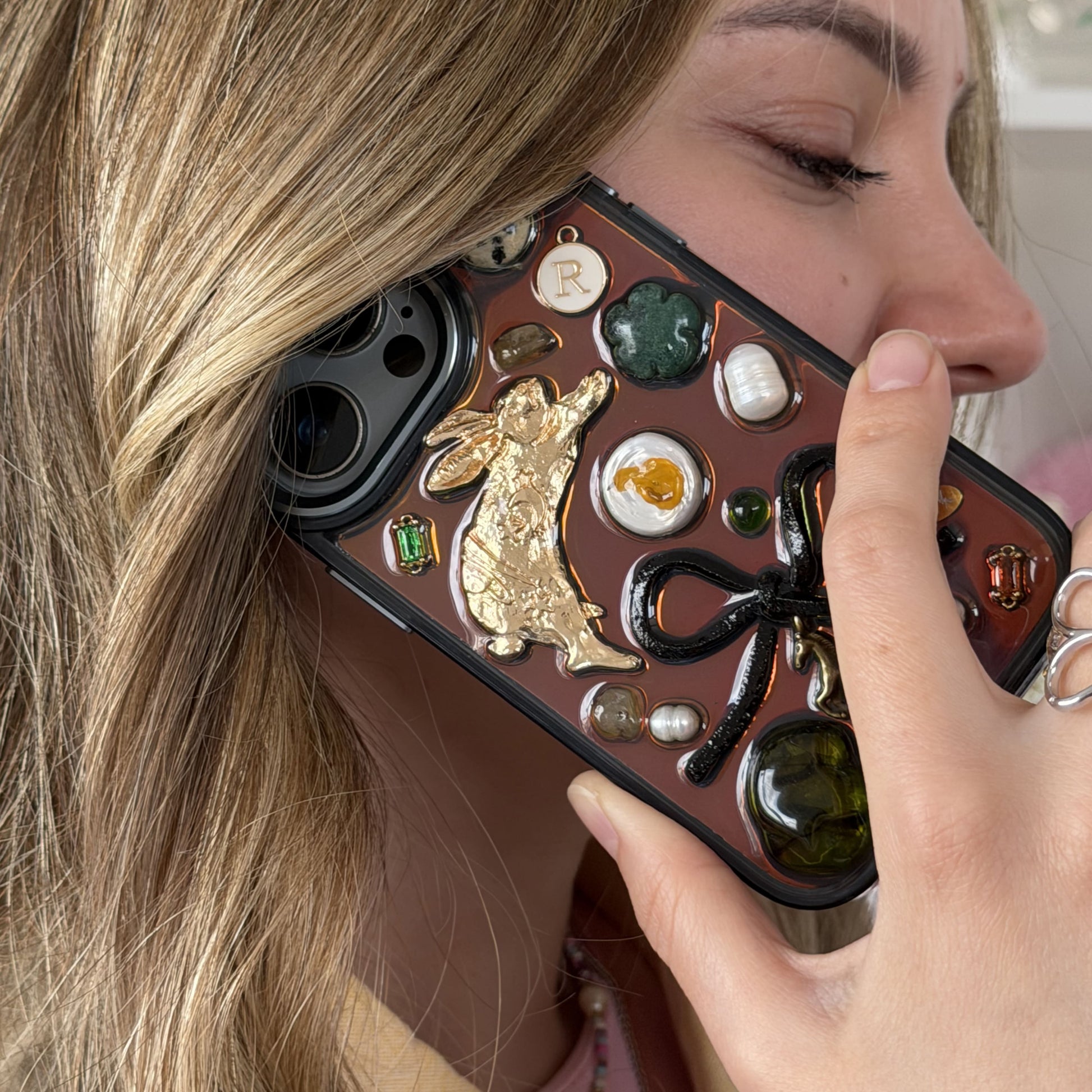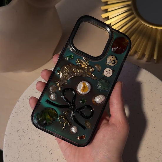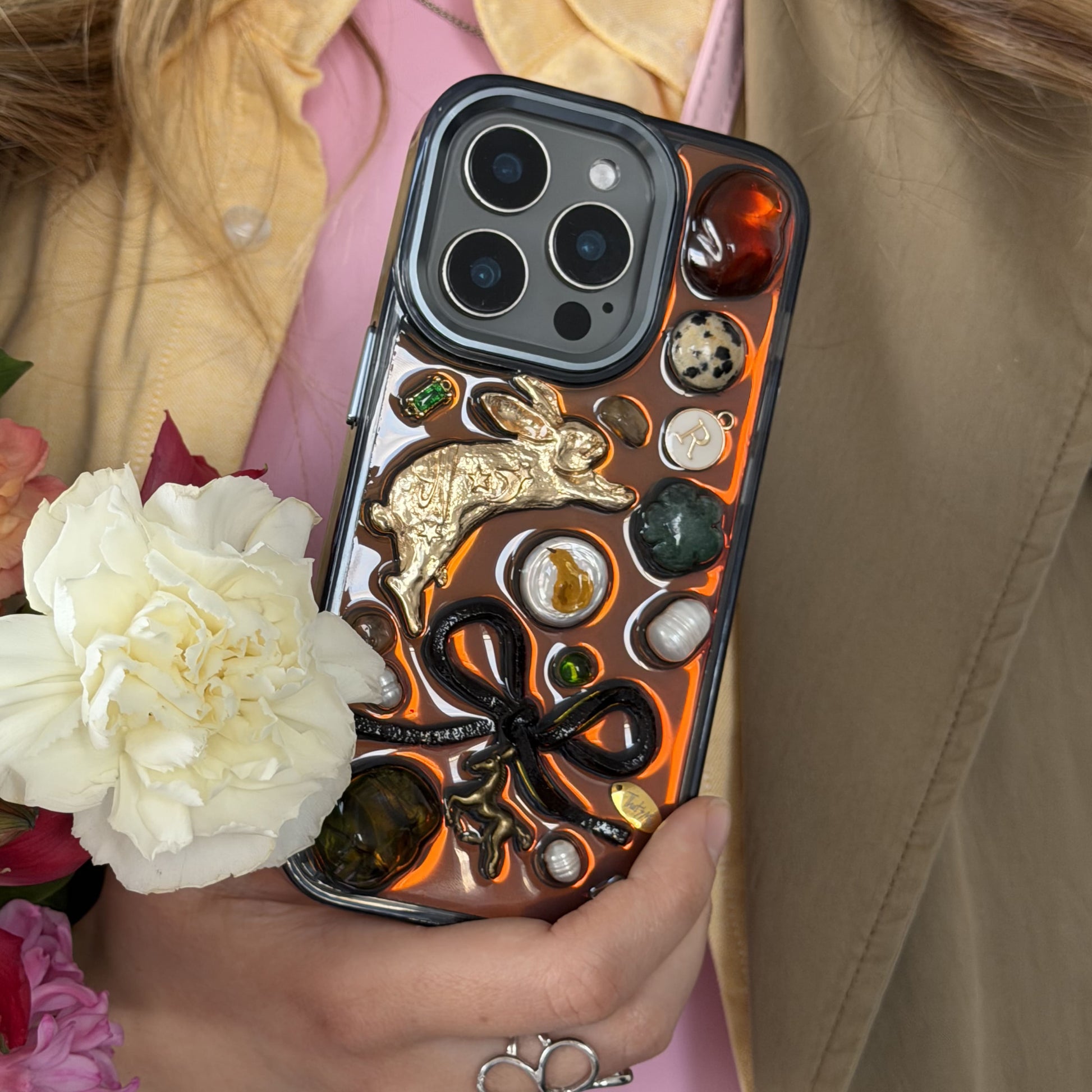 Limited edition design with natural pearls, stones and a personalized letter. Also included is a shiny insert for the case, which can be removed or inserted as you wish 🤍